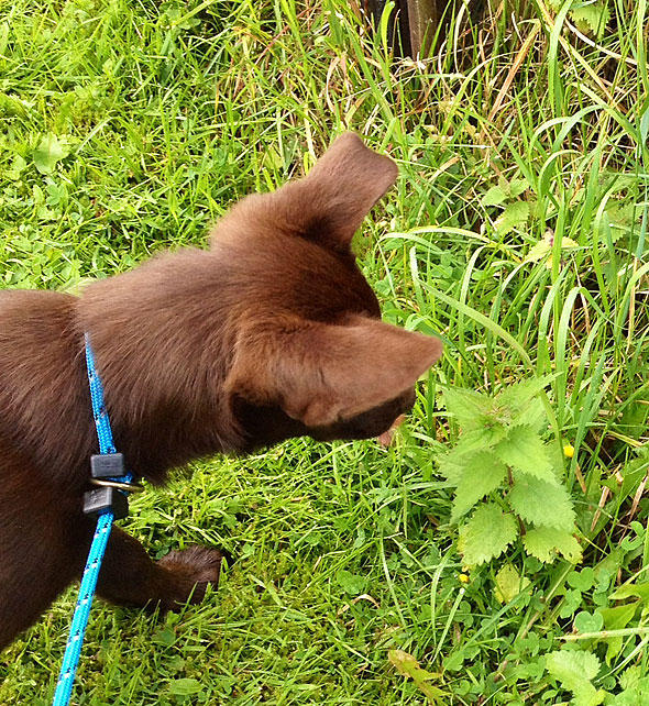 Något han inte har lärt sig är att brännässlor bränns. Jag har tappat räkningen på hur många gånger han smakat på dem för att sedan spotta och fräsa ilsket. Senaste taktiken är att hugga tillbaks när nässlorna är dumma. Tveksamt om det hjälper, men trägen kanske vinner? 😉