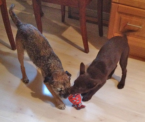 Delvis tycker Karlsson nog att det är riktigt roligt med en brottningsmatch då och då, eller att ha någon som hänger i andra änden av leksakerna men när han inte tycker det går inte budskapet fram riktigt. Eftersom han konstant, när de drar i samma leksaker, låter som en mycket stor och ilsken humla är skillnaden, åtminstone i våra öron, hårfin när han säger ifrån. Maro backar möjligen undan en sekund men sen är han ”på” det igen, som en… som en… terrier?!