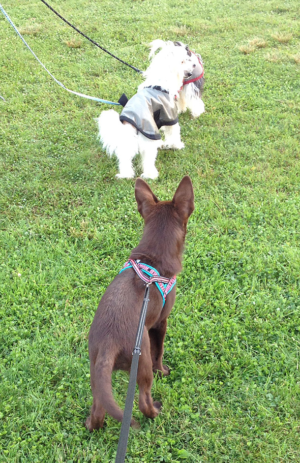 För övrigt lekte vi och tränade på koncentration och ögonkontakt och jodå, han får klart godkänt med tanke på sin ringa ålder. Karlsson var också med och fick köra lite lydnad. Dessutom fick han mingla på altanen och tigga hamburgare när träningen var slut. Det var nog dagens höjdpunkt tror jag. 🙂