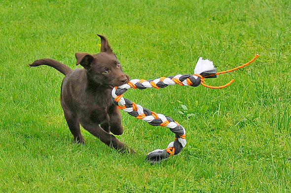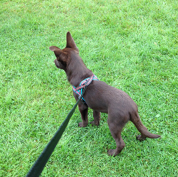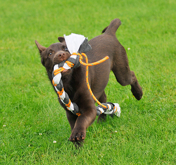 Igår eftermiddag, när arbetstiden var slut, var det faktiskt ganska ok väder (=uppehåll, man har inte så stora krav efter sista tidens skyfall) så jag tog med mig kameran och valpen och gick ut på gräsmattan för lite fotning. Valpen är ju hyfsat vattentät men jag kan tyvärr inte säga detsamma om kameran… Det hade ju varit ännu bättre om jag inte överskattat ljuset och kört på inställningar som var generalknasiga. Men med lite photoshoppning gick det att rädda några bilder i alla fall.