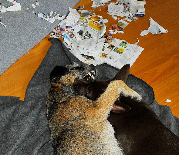 Karlsson blev kanske så trött av att se alla pappersstrimlor på arbetsrumsgolvet (”lövblås/lövsug” står på mattes mentala inköpslista 😉 ) att han somnade av ren utmattning. 🙂 Nu ska det ju erkännas att Karlsson mestadels har fått tillbringa dagarna sovandes i favoritsoffan, på favoritfleecefilten, i favoritvardagsrummet för att inte helt tappa sans och vett. Maro har sovit med mig i arbetsrummet. Men när de hade brottats på ett vänskapligt och ganska ljudlöst sätt en stund efter lunchpromenaden bestämde jag mig för att det var dags. Och det funkade! Halleluja!
