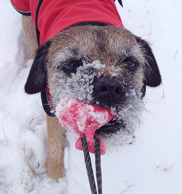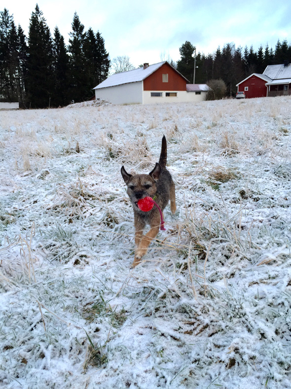 Nu i veckan kom snön och DET var spännande. Så spännande att den lilla yngligen inte ens hann kissa… Det var ju miljarder kalla, vita och galna flugor som skulle fångas för bövelen! Den snön försvann rätt fort och igår kom det en ny omgång som snart också är försvunnen. Helt onödigt med andra ord… Får jag önska mig något av tomten så är det definitivt en grön vinter med mycket spårträning.