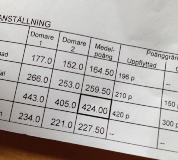 Jag och Karlsson tävlade KM i bruks och rallylydnad. I rallyn gjorde chauffören några dyra missar men brukset gick desto bättre. Vi kom på en tredjeplats men det viktigaste var att känslan på lydnadsplanen var tillbaka! Det var den bästa högreklasslydnaden han gjort på flera år tror jag, och vi hade verkligen roligt – både han och jag. Den förargliga 5:an på framåtsändandet berodde på att nyfiken liten hund var tvungen att kolla ett skräp på planen och råkade komma ur kurs på andra sträckan…