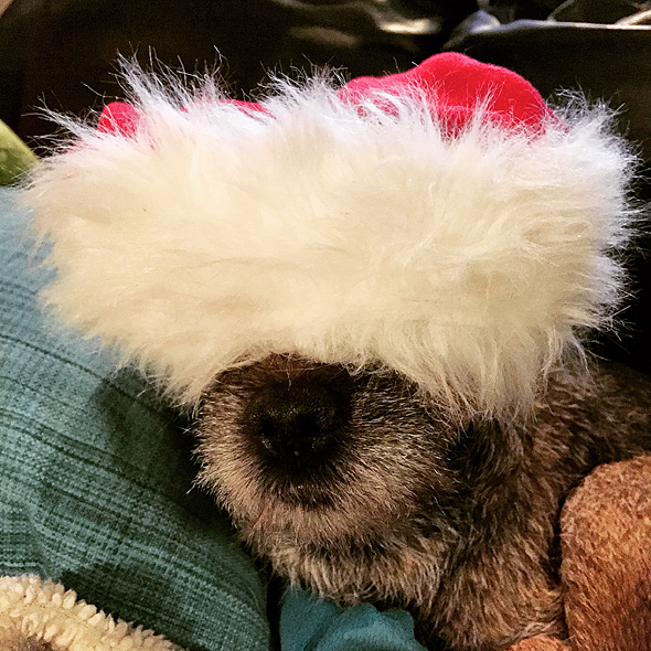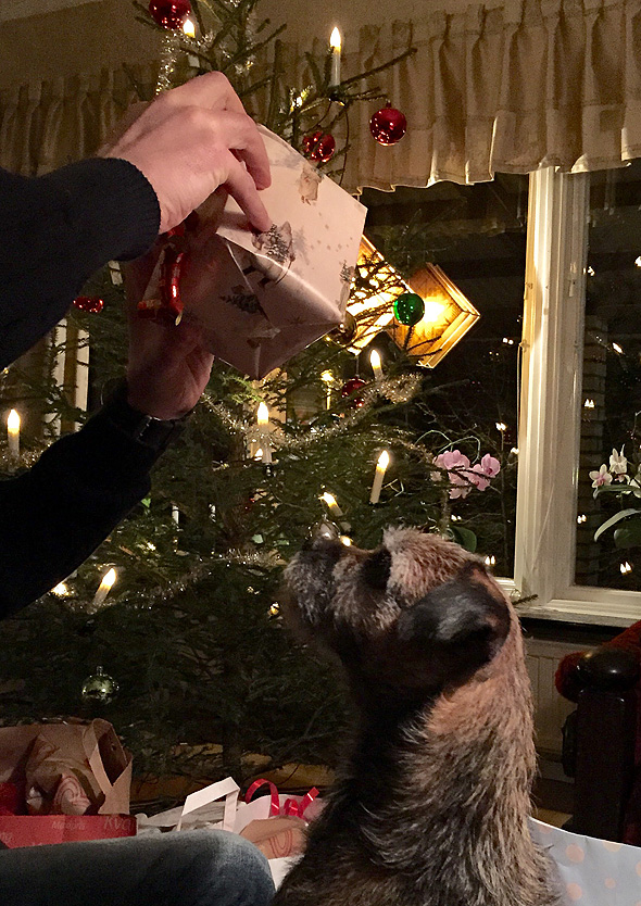 I helgen var jag helt plötsligt tvungen att ta kort på hundarna i tomtemössa. Det är sådant som inträffar när man vill slippa göra något annat och ”viktigare”. Jag passade på när de var för trötta för att protestera. Eftersom de flesta av husets prydnadstomtar har mössan nedragen till nästippen körde vi på samma tema. 😉