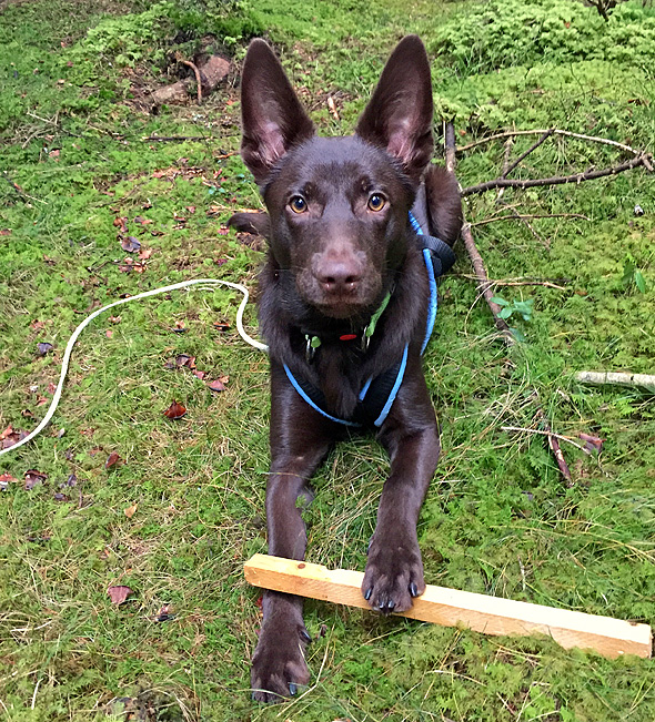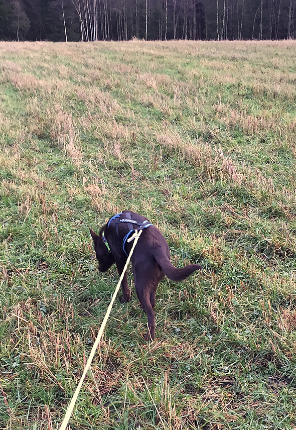 Han började också förstå det här med spår (även om det inte finns dokumenterat på bild) och är nog den mest naturliga spårhund jag någonsin haft. Det finns en del att förstöra där också, om jag jobbar hårt. 😉