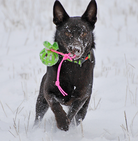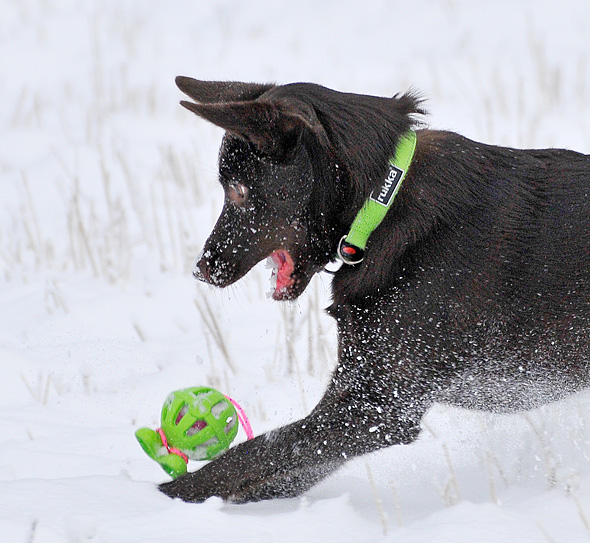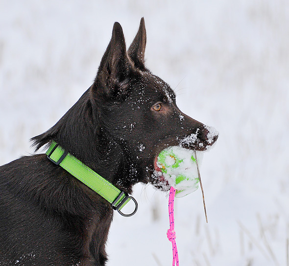 Att fota mörk, enfärgad hund i snö i mulet väder var troligen månadens sämsta idé, men nu vet jag det – inte göra sig till och fota kelpie med finkameran, varken med eller utan snö, om inte solen skiner.