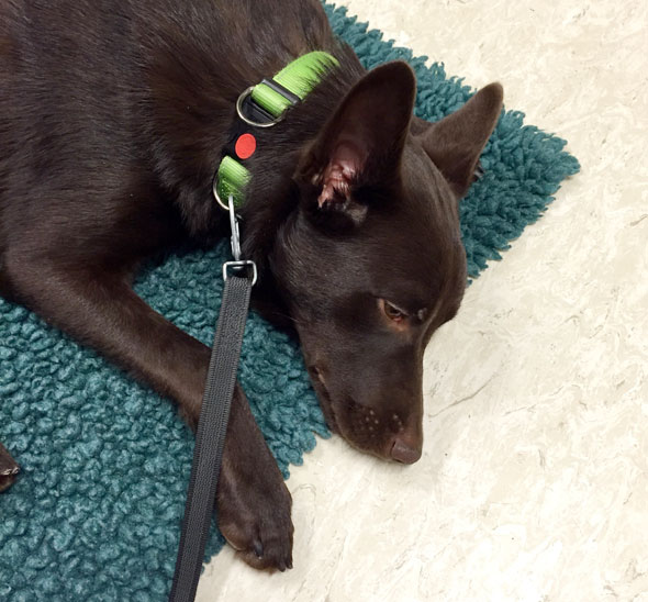 Trött och mosig har han varit även efter hemkomsten, trots att han bara fick lugnande för 10 av sina 16 kilo och trots piggelinspruta.