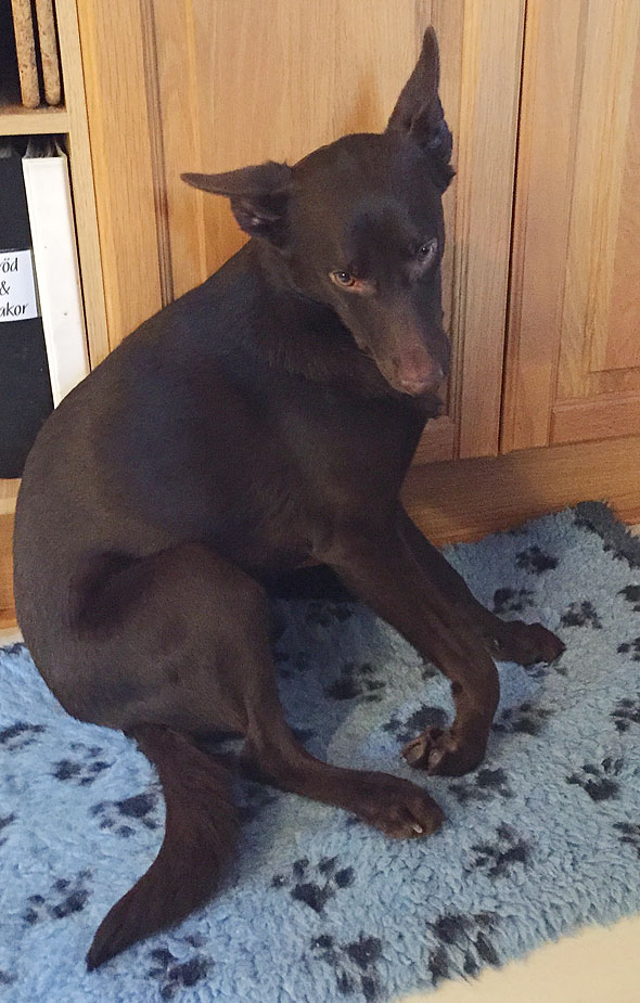 Igår på dagen fick han diarré och det tilltog under kvällen. Till sist kom det i princip bara vatten. Märkligt nog var det sedan lugnt under natten men när jag gick upp, tidigare än vanligt, i morse och tog ut honom var det inte kul. Det kom ytterligare lite ”vatten” och sen for han omkring och skrek rakt ut när han försökte klämma ut något, gud vet vad. Ev. fick han också ut något, typ gräs/tyg, men i ficklampans sken och med en hund som for runt vilt ylande i galopp var det inte lätt att se vad som hände. Eftersom han varit lite irriterad på sin bakdel i någon vecka (analsäckarna kollades, u. a. förra veckan hos veterinären) kände jag att nu var inte ”avvakta” en bra strategi längre.
