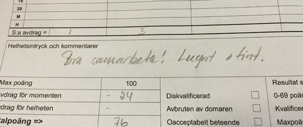 När vi kom i mål så kändes det bra. Inga direkta missar som jag var medveten om. Därför blev jag lite snopen när jag på resultattavlan såg att det stod 76 poäng. Vafalls…? Men med höstens KM i minnet, där vi tappade 20 poäng på sådant jag inte ens var medveten om hade hänt, så anade jag ju ett liknande scenario. Medan vi funderade på det, den ena av oss förmodligen mer än den andra 😉 , satt vi på läktaren och väntade på prisutdelningen och snackade med kompisar. Med tanke på att det heter ”rallylydnad” tar det förvånansvärt lång tid. 😉