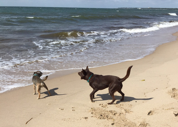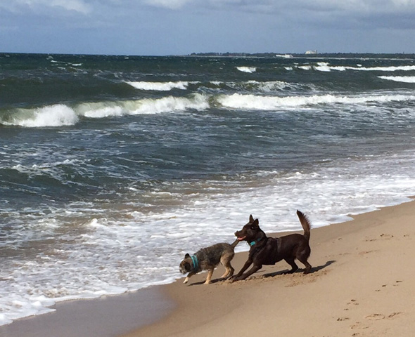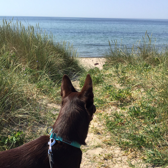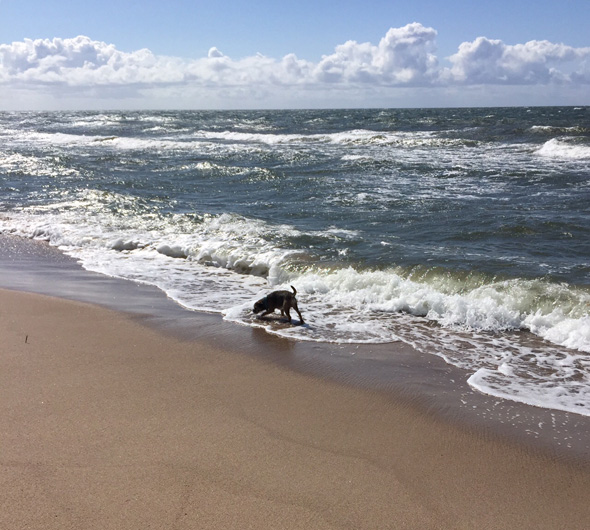 Maro, som knappt sett annat vatten än det i vattenskålen, blev lite övermodig första morgonen och gjorde en frivolt i vågorna. Frivolten hann jag inte fotografera… Sen gick han inte nära vattnet igen. Karlsson som är lite mer härdad plaskade runt i strandkanten lite. Temperaturen gjorde väl att suget efter riktigt bad inte var så stort.
