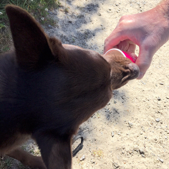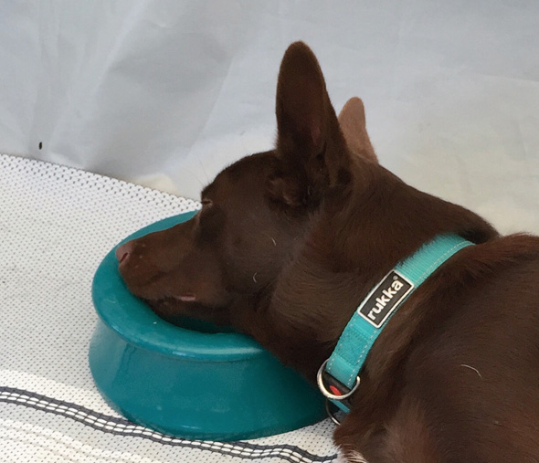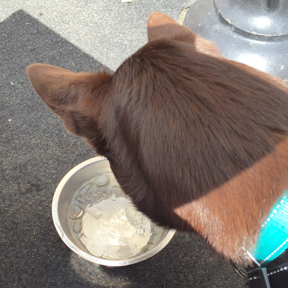 I Simrishamn var hundar ”självklart” välkomna och serverades isvatten snabbare än vi hann blinka. Isvatten var dock skumt sa Maro som tuggade is en stund för att sen välta skålen…