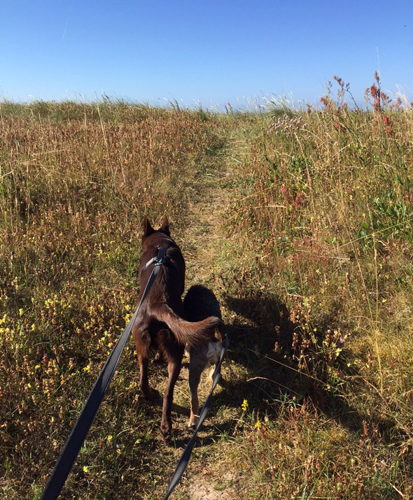 När vi kom ner var det infernaliskt varmt men natten mellan söndag och måndag byttes värmen, via ett åskväder, ut mot mer hanterbara temperaturer, framför allt för hundarna. De lägre temperaturerna och blåsten gjorde att stranden var folktom och varje morgon/förmiddag kunde vi ta en rejäl promenad på den helt folktomma stranden och hundarna kunde vara lösa. Helt ljuvligt!