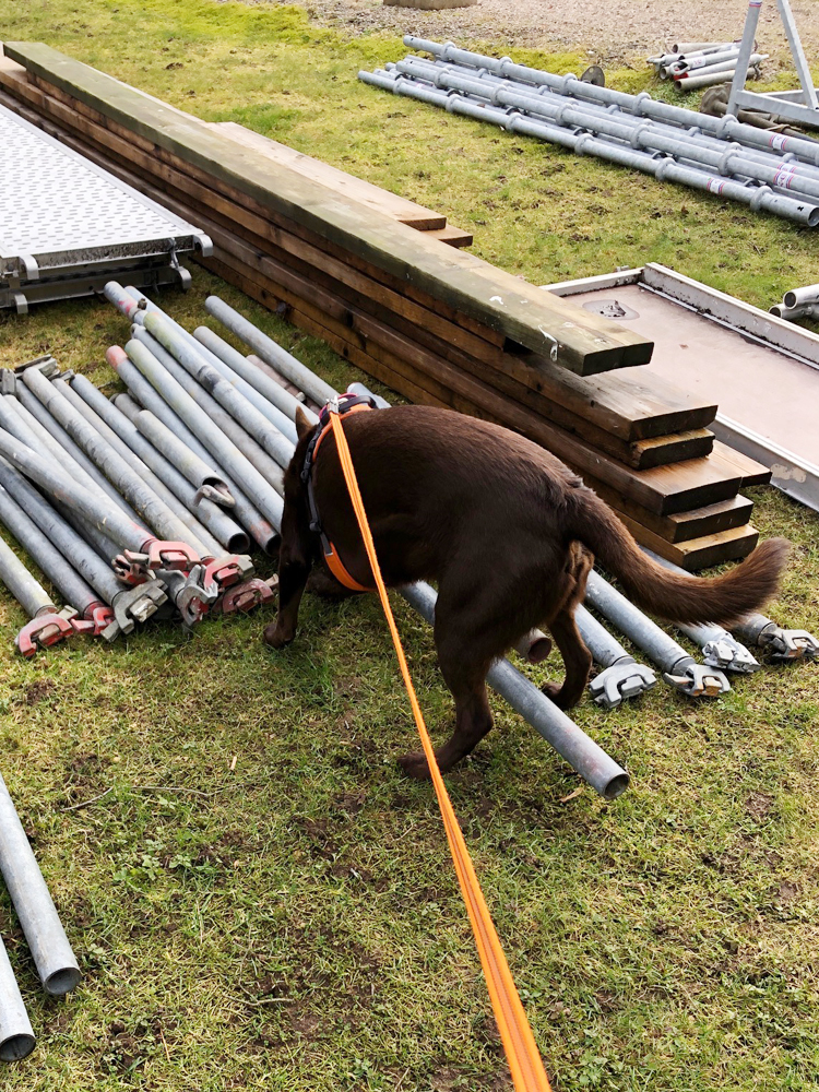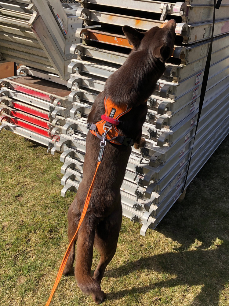 🙂 Det bortblåsta taket resulterade i byggnadställningar på hemmaplan – perfekt för att träna specialsök.