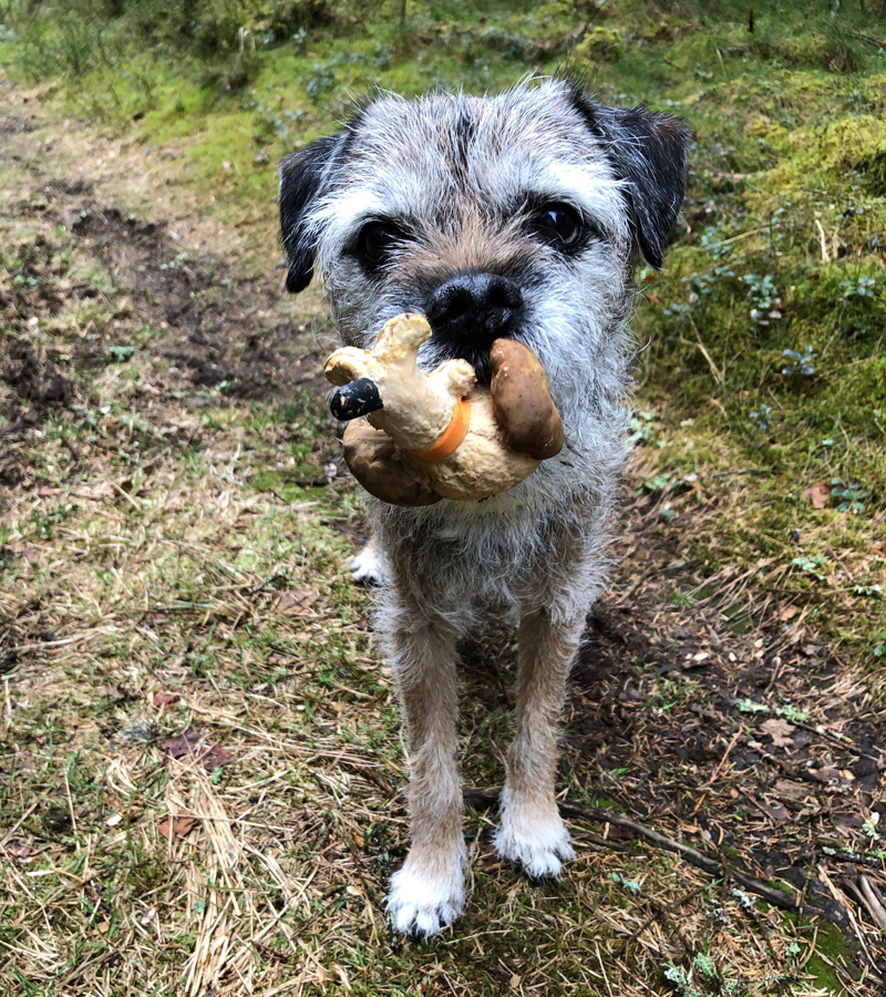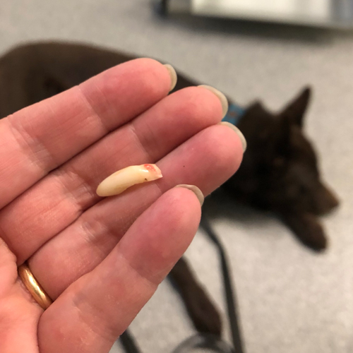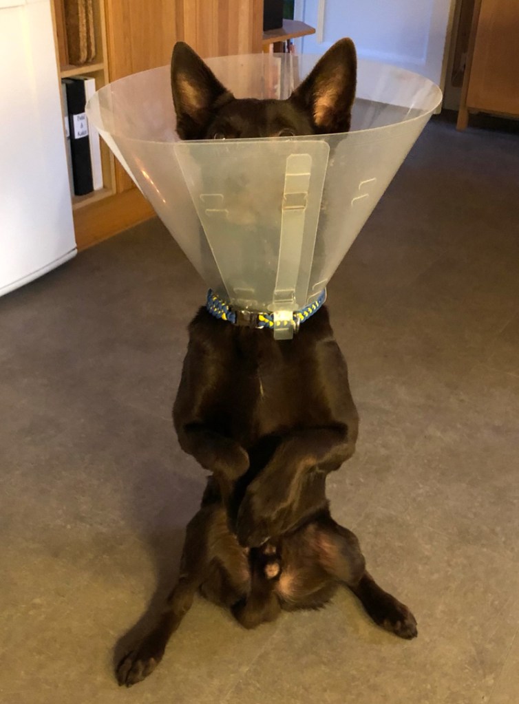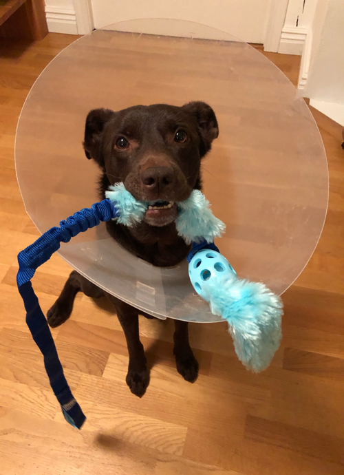 😦 Efter ett uppletande i början av månaden var Maro påtagligt irriterad i sin mun. Med hjälp av en träningskompis upptäcktes att han hade en kraschad framtand i överkäken. Jag bokade tid för att få den borttagen men när jag sitter hos veterinären och väntar på att han ska somna efter att ha fått lugnande så ramlar det ut en halv hörntand ur underkäken?! WTF? Det händer ju inte? Sannolikt har skadan uppkommit samtidigt som tanden i överkäken men ”höljet” hade suttit kvar. Han fick en piggelinspruta och så fick vi åka hem och mata honom med Metacam i avvaktan på en ny tid, två dagar senare, på systerkliniken där de hade rätt utrustning för att ta bort hörntanden. Dock hann de bara med hörntanden då så ytterligare en ny tid bokades. Men … han fick en infektion där hörntanden suttit så operation nr 2 blev tidigarelagd och … då hittades ytterligare två (kind)tänder som behövde tas bort. Detta fixades fredagen innan jul. Efter en dryg vecka med tratt och inspektion av veterinären med OK-stämpel på näsan åkte tratten av. Nu håller vi tummarna hårt för att han får behålla resten av sina tänder länge.