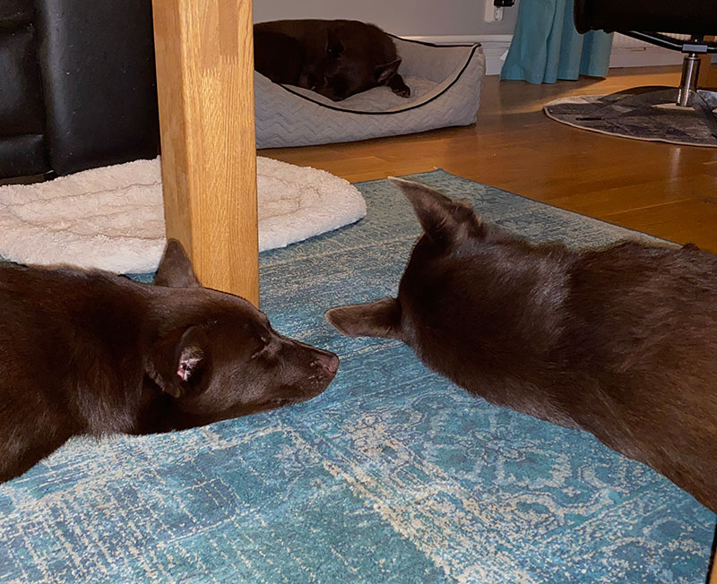 Vi avslutade dagen med spår här hemma i skogen när det började mörkna. Mörkerspår är inte riktigt min ”cup of tea” men vi överlevde utan brutna ben (och utan pannlampa) och på kvällen var hundarna ännu lugnare. Gullan/Skojja somnade en decimeter från Maros öra. ❤
