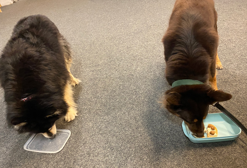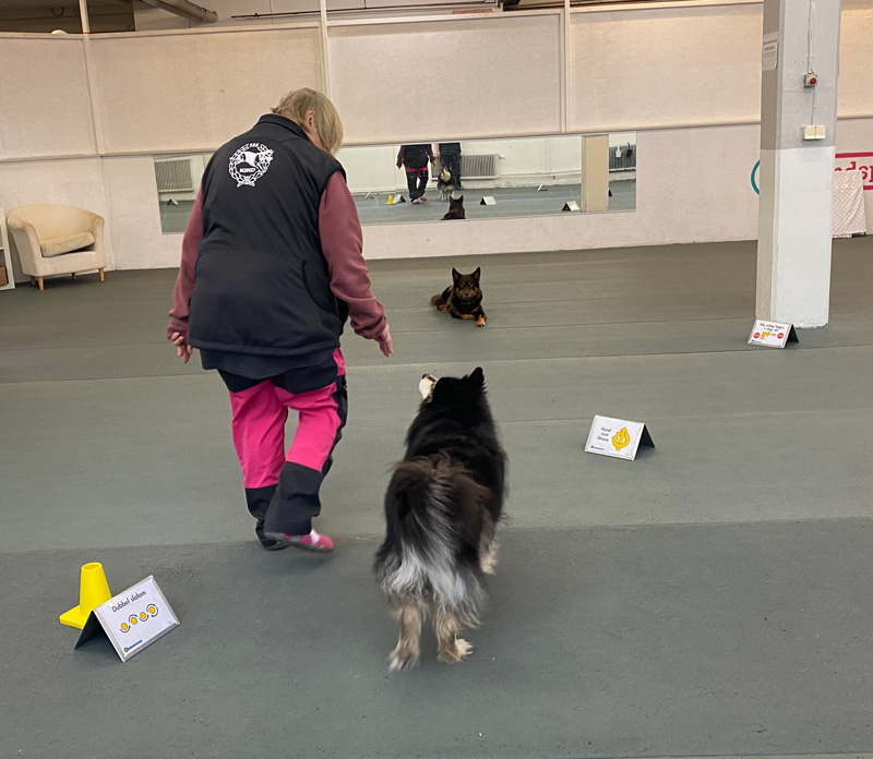 Därefter blev det en timmes bra träning med vår rallycoach och vi körde till och med bana med högerhandling vilket han löste över förväntan! När Riina körde bana fick han ligga plats med mig på andra sidan banan och det skötte han utmärkt. 😍 Det hela avrundades med pannkakstårta till hundarna och fika till mattarna. Nu sover han sött och vilar upp sig för kvällen och provsmakning av innehållet i påsen med gott och blandat. 😋