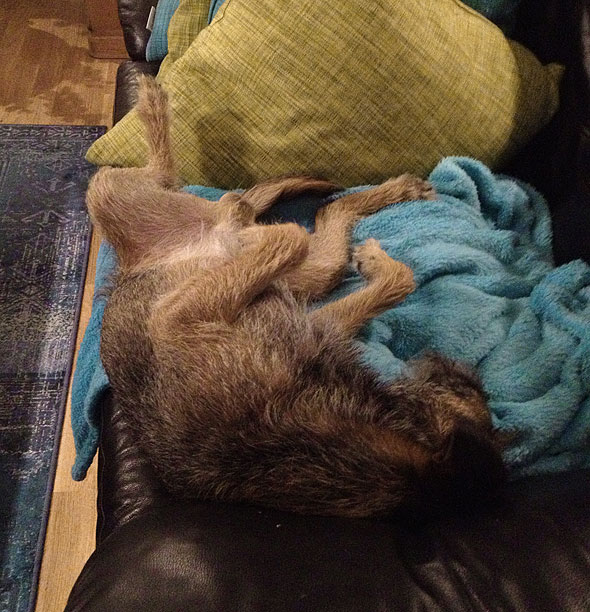 Under natten har det ynkats en hel del, muntligen, och sömnen för alla i familjen har varit rätt usel. Idag är hon piggare, har både ätit med god aptit och druckit men ynklig är hon fortfarande. Piper, gnäller, suckar och stönar. Eftersom hon fick smärtstillande innan hon lämnade djursjukhuset igår har jag fått order om att inte ge första Rimadylen förrän ikväll men det känns onekligen som om det skulle behövas lite tidigare?