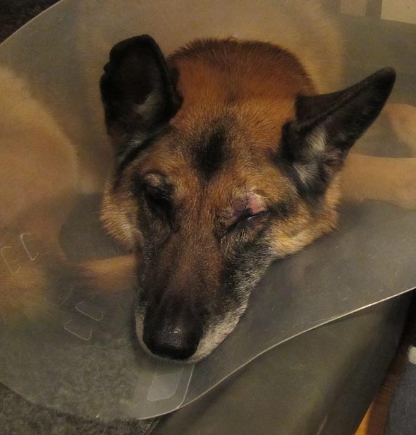 Hon har tratt för att hon inte ska kunna slicka eller bita i operationssåret? Slicka eller bita sig i ögat?! Nåja, tratten behövs nog mer än vid någon tidigare operation för hon vill gärna krafsa med tassen så den får sitta på.