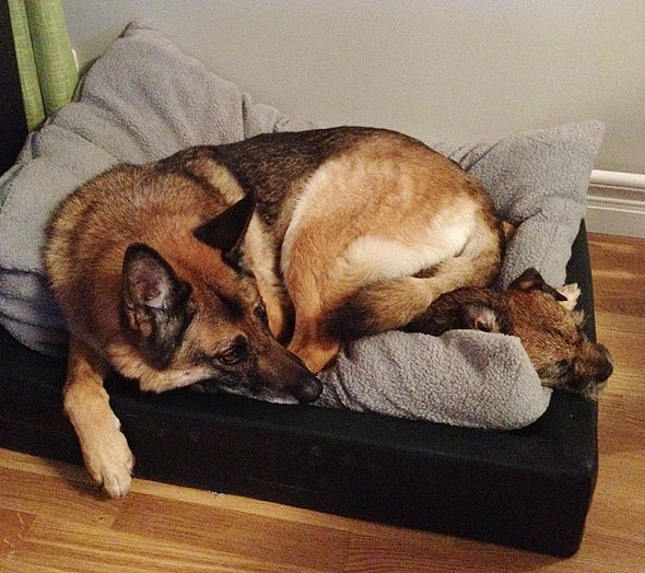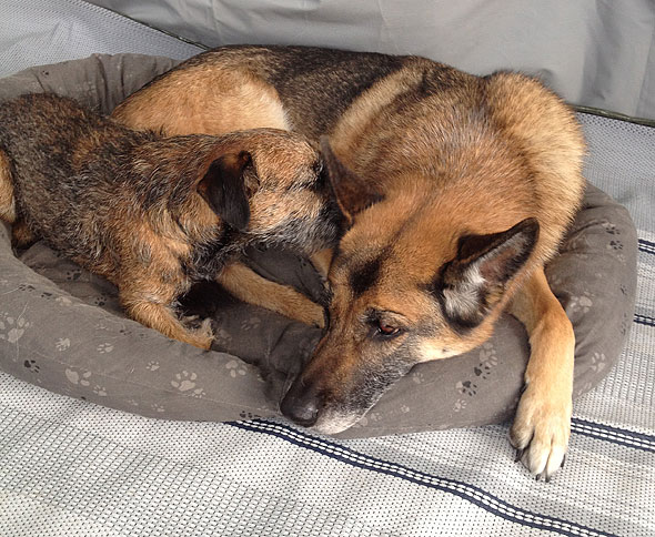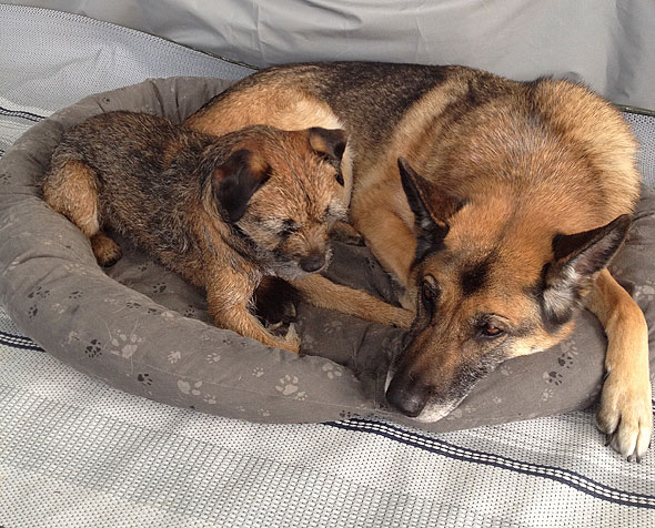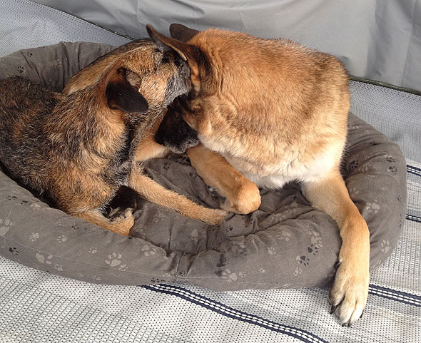 Att vara hemma igen uppskattades nog inte bara av mig. Även hundarna verkade rätt nöjda men till sist tröttnade Iza på att lillebror lagt beslag på hennes säng och la sig helt sonika ovanpå honom! Han verkade inte misstycka och låg faktiskt kvar där en stund. 🙂