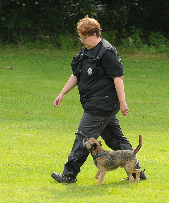 Rutan: 0 (extra kommandon, tar in hunden) På mitt första kommando skenade han iväg snett åt höger. Förmodligen i syfte att kolla av något luktagott som han fick i nosen redan under sitt i grupp. Jag kallade in och skickade om och han sprang rakt mot, och igenom, rutan. Jag försökte kalla in lite försiktigt varvid han satte av i full sken mot mig och jag hann inte lägga honom innanför markeringen. Där trodde jag att momentet redan var nollat och kallade in eftersom tl var tyst och inte kommenderade mig ”framåt marsch”. Men jag kanske kunde ha fått honom på fötter och in rutan och räddat några poäng??? Svårt att avgöra vad som menas och vad som gäller? Nåja, det hade kanske putsat slutpoängen något men inte till några bragdresultat… Måste dock kolla med någon/några domare vad som gäller. Jag har levt i tron att har hunden väl lagt sig på fel ställe, så är det kört.