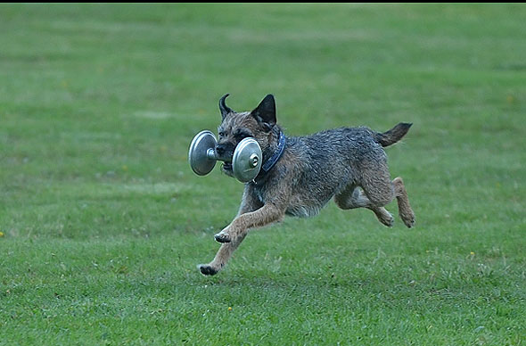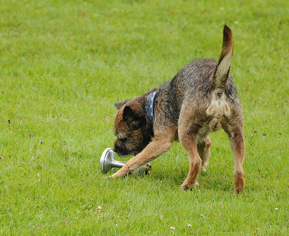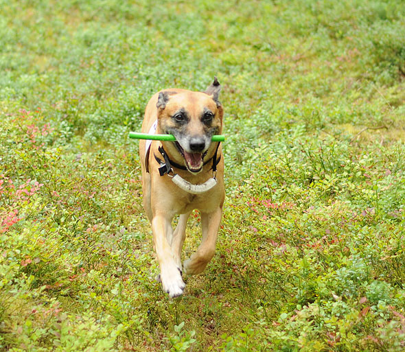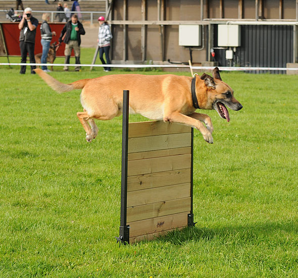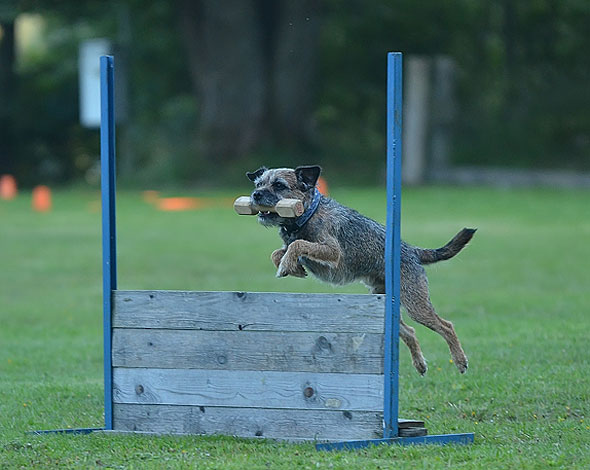 Hopp/apport: 7 (flera kommandon) Här återföll han i sitt ”sitta kvar”-beteende, trots att jag bara sa sitt innan jag kastade.