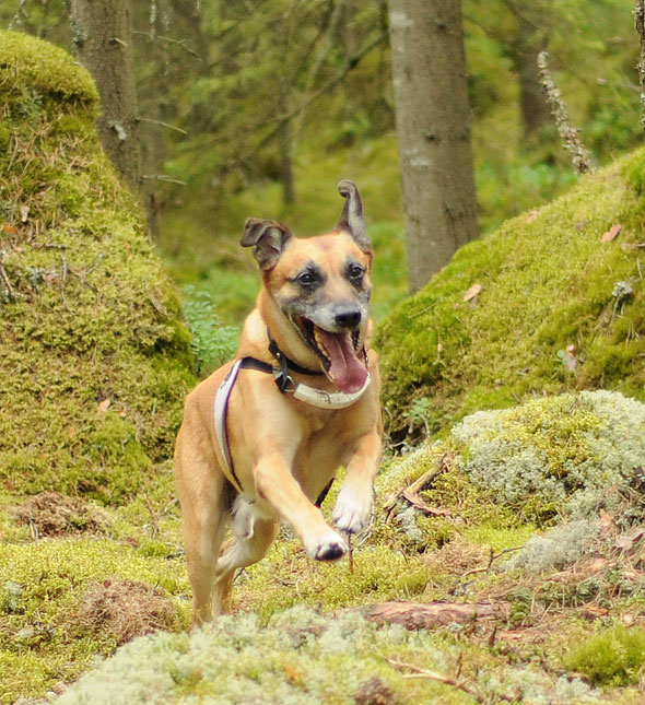 Sen traskade vi iväg och plockade pinne efter pinne även om det på något ställe kändes lite långt emellan ett par av dem. Vi hade också ett par stopp med Hälge-sniff i luften men där han valde att fortsätta på spåret. På ett ställe snurrade vi ett tag innan han bestämde sig för att prioritera rätt. När jag hade sex spårapporter i midjeväskan vinklade han distinkt höger och drog iväg uppför en liten brant. Draget i linan blev lite kraftigare och tempot gick upp. Min mage skrek desperat åt mig ”HAN SPÅRAR VILT!”. Men … man ska ju lita på sin hund, har jag hört. Det krävs väl nerver av titan för att bryta en hund som helt uppenbart spårar, även om det är oklart vad. ”Lita på din hund, lita på din hund, lita på din hund…” Ja ni förstår?