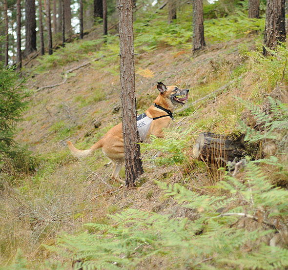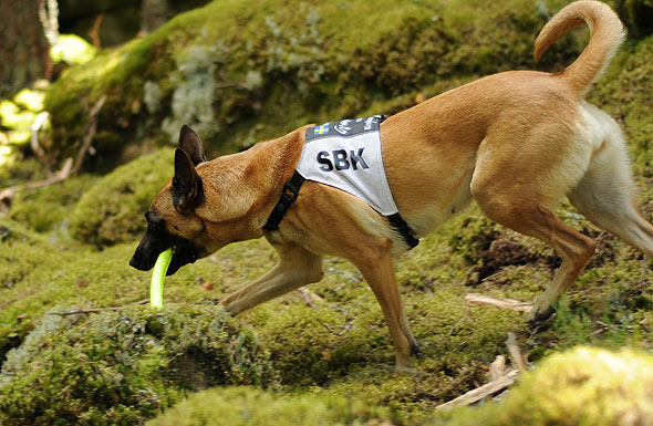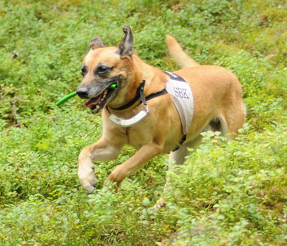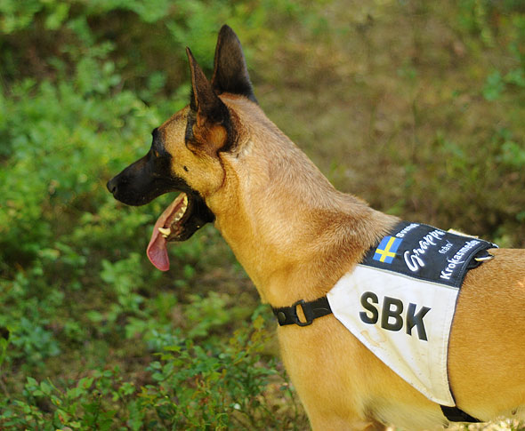 Bosse kämpade på men missade tyvärr en nedgrävd figurant. Som tur var hittade han de två andra, så de fick fullfölja sitt sista SM. Så här ser en glad (men trött) Bosse ut med rulle i munnen när han hittat sin andra figge (som egentligen var den tredje).