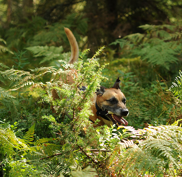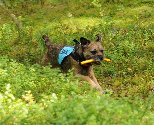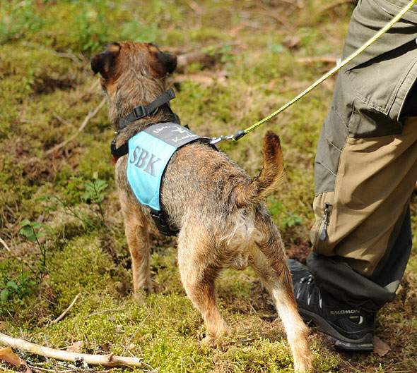 Han verkade riktigt taggad innan upptaget men när jag skickade ut honom i rutan lommade han iväg och … KÄKADE BLÅBÄR?! Mer av tur än skicklighet vacklade han på spåret och tog det åt rätt håll men sen var det inte många rätt. Två pinnar hittade vi sen, efter uppskattningsvis halva spåret, kom vi fram till en lerig skogsväg som han tyckte verkade trevlig att gå på. Efter ca 100 meter bestämde jag mig för att det var fullständigt tokigt (delvis pga bristen på spår av mänskliga fotbeklädnader i leran) och tog tillbaks honom till där vi kom fram vägen. Då snubblade han iväg rakt över vägen istället och det var nog rätt, men sen ballade det ur igen och efter 24 minuter stod vi på vägen, 100 meter från bilarna, med två pinnar i min magväska och så var den dagen förstörd. Vi var inte alls långt ifrån slutet men vad hjälper det när man bara har två pinnar och uppenbarligen inte varit i spåret en stor del av tiden?