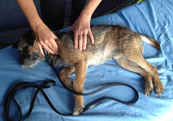 Sen bjöd jag Karlsson på proffs-massage. Vår trimtant, V, har nämligen utbildat sig till massör och fanns på plats. Han tyckte det var skönt och slappnade av bra i det fladdrande tältet mitt på marknads-gatan. Ömsom himlade han med ögonen och ömsom somnade han nästan. 🙂 Han fick med beröm godkänt och var mjuk och fin i alla muskler. Ska nog försöka göra detta före och efter säsong i alla fall, och kanske fuska lite hemma mellan varven? Iza har ju aldrig trivts med att bli masserad. När de försökt på djursjukhuset i samband med simningen så har hon liksom aldrig ”haft tid”… Nåja, Karlsson tyckte det var skönt och ett betydligt trevligare alternativ till pälsryckning och kloklippning som är det V oftast ägnat sig åt när vi träffats. 🙂