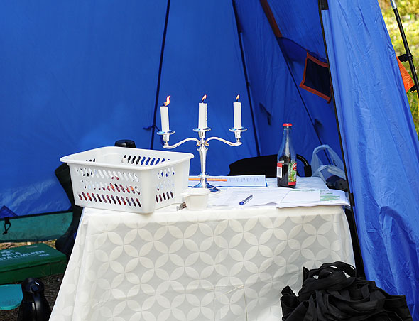 När vi anlände till sökrutan möttes vi av detta. Ett funktionärstält med vit duk och kandelaber?! Mitt i skogen! Hög mysfaktor på det! 🙂
