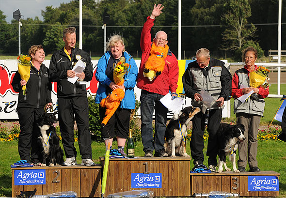 Jag lyckades med konststycket att tokmissa rapportekipagets lydnad och uppletande men – summa, summarum – lilla Kind BK (ca 170 medlemmar) fick en Svensk Mästare i år igen!! Torbjörn och X-man försvarade sin titel i rapporthundsgruppen och fick stå överst på prispallen för andra året i rad! Mycket bra jobbat, i synnerhet som 12 av 20 ekipage i rapporten bröt tävlingen på lördagen. Även i skydd och sök blev det samma segrare som förra året. Det är stabilt och ingen kan kalla det ”tur”!